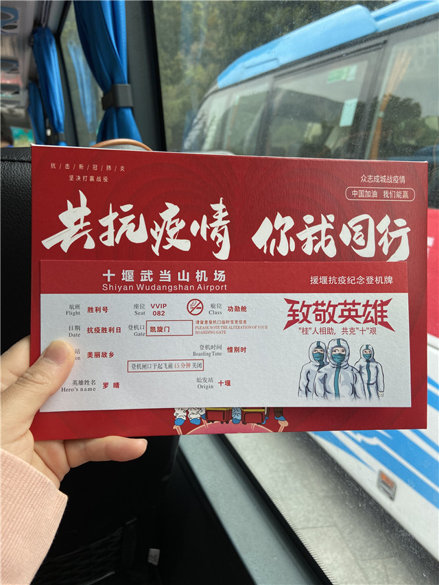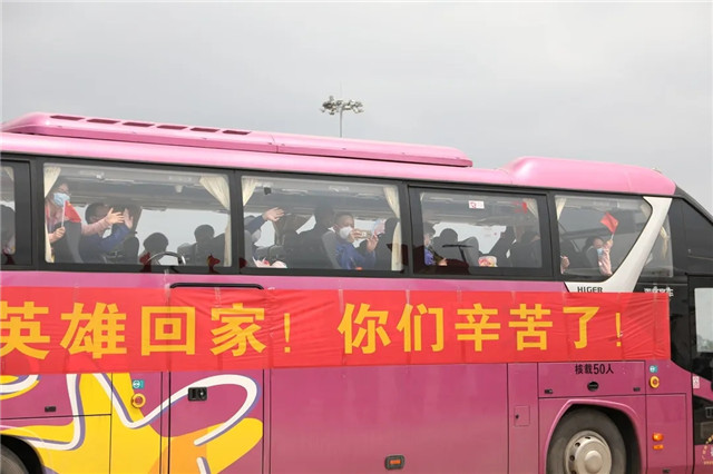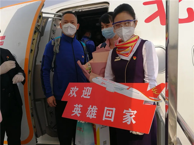 来到武当山机场,早已在此等候的志愿者们高喊:“欢送英雄回家!”