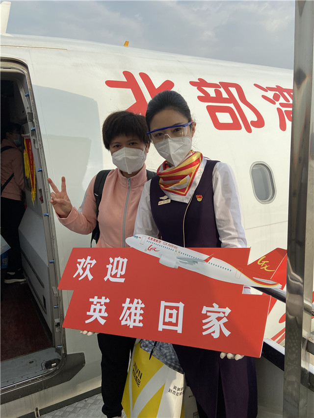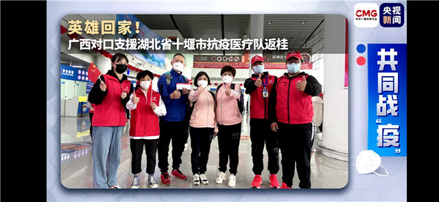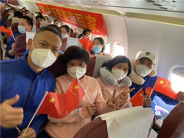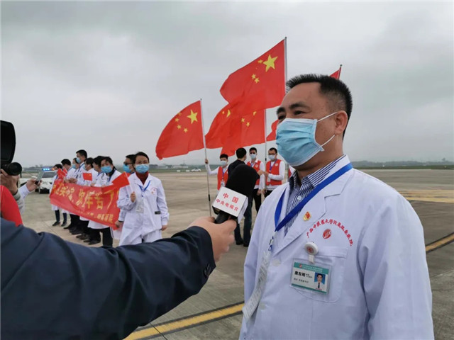“五星红旗迎风飘扬,胜利歌声多么响亮……”飞机上,广西医疗队员们唱起赞歌。