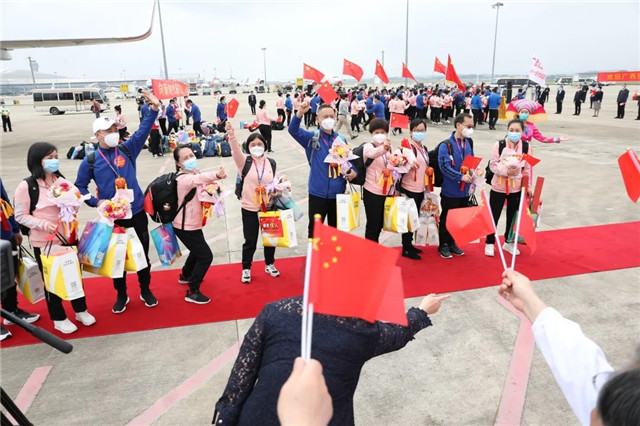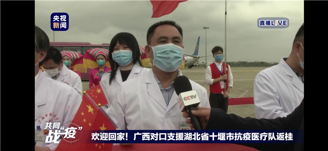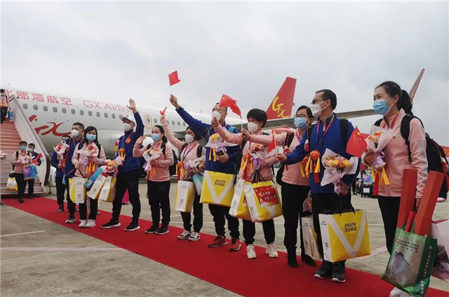 阔别月余之后,再见家乡亲人,顺利凯旋的广西医疗队员们显得格外开心。