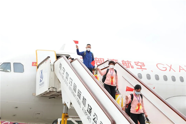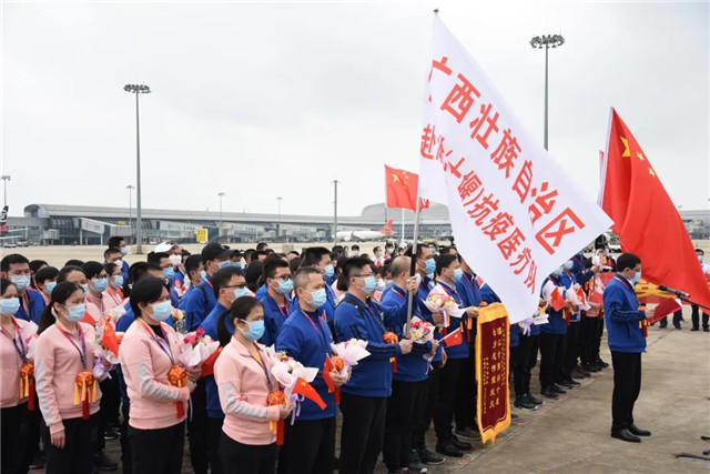 短暂的迎接仪式后,广西医疗队员将前往酒店进行休整和安全隔离。