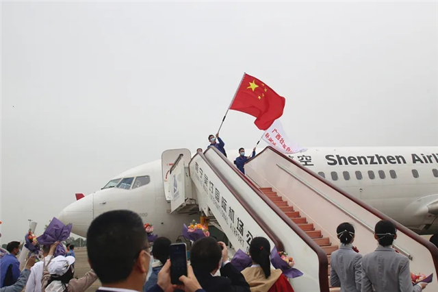 3月29日15时40分,在大家的期待中,搭载着广西第四批援助湖北省抗疫医疗队的“胜利号”顺利落地!当机舱门开启,队员们带着胜利的笑容,依次走下飞机舷梯,等待多时的工作人员为他们献上鲜花,同声高喊:“欢迎英雄回家!”
