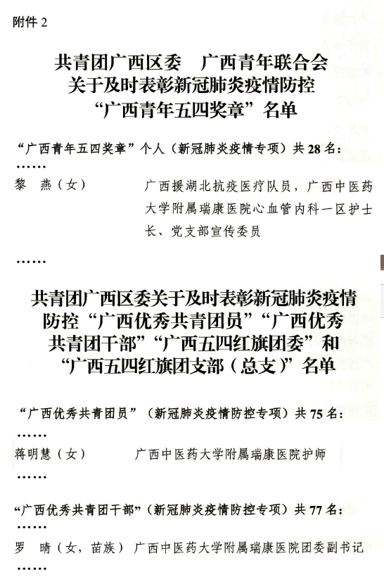 其中,我院心血管内科一区护士长黎燕被授予“广西青年五四奖章”(新冠肺炎疫情专项),医院护师、团委副书记罗晴被授予“广西优秀共青团干部” (新冠肺炎疫情专项),神经内科二区护师蒋明慧被授予“广西优秀共青团员”(新冠肺炎疫情专项)。