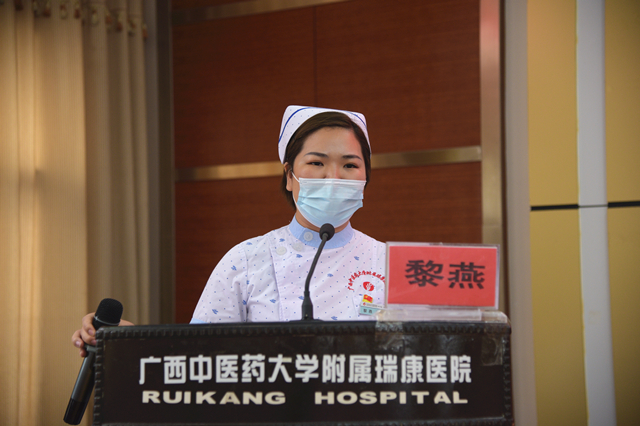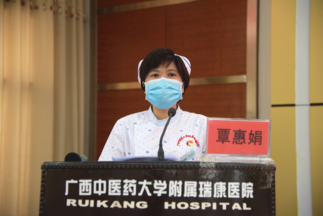 疫情就是命令,防控就是责任。在新冠肺炎疫情暴发时,我院援湖北医疗队员覃惠娟、黎燕两位护士长将他们的抗“疫”经验在大会上与大家分享。护士长覃惠娟用朴实的语言,回忆自己在抗疫前线的经历与感人瞬间,用实际行动展现了新时代护理工作者的责任与担当。护士长黎燕以诗朗诵的形式饱含深情地叙述了我院抗疫护士们在武汉沌口方舱和协和医院西院抗击新冠肺炎疫情期间的点滴故事,在场人员都被她们在抗疫一线中展示出的高度使命感、责任感和专业性而感动不已。