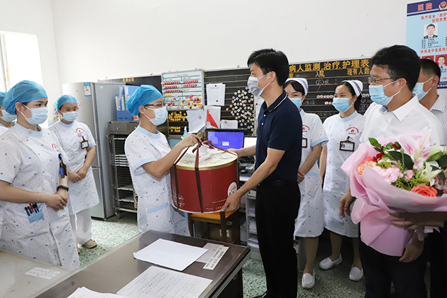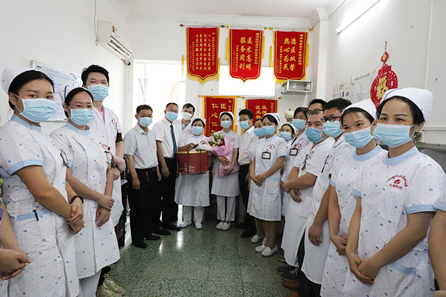 5月12日上午,县卫健局局长卢国坚在院区领导梁春才、林宗汉、黄建东及院办、护理部等职能科室负责人的陪同下,亲切慰问临床一线辛勤工作的护理人员,把饱含着关爱的蛋糕及鲜花送到了护士们手中,真诚地祝福护士们节日快乐、工作顺利、幸福安康。