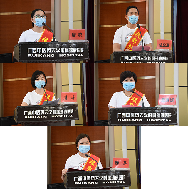 队员代表唐晓、杨益宝、潘玲、覃惠娟、黎燕依次发言,讲述了他们援鄂战疫的感人经历,分享了前线工作的体会、见闻、感受、收获,表达了对党和政府,学校和医院,“战友”和家人的支持和感谢。