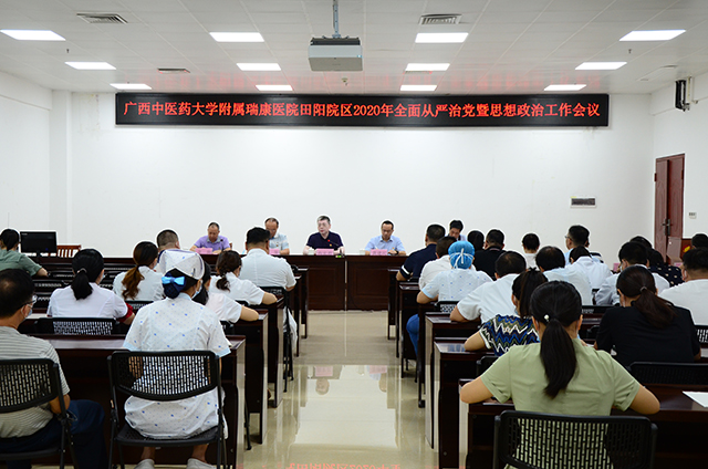 7月27日下午,田阳院区召开2020年全面从严治党暨思想政治工作会议,医院党委书记高宏君、纪委书记黄建民、副院长宋策出席会议,医院党委办公室、纪委办公室、监察室和财务部的相关负责人参加会议,田阳院区党支部书记甘照儒,执行院长龙驹,副院长陆秀伟、陈威、张巍及中层干部代表参加工作会议。龙驹主持会议。