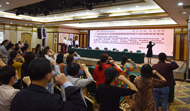“作为医院中层干部,我庄严宣誓:严格遵守国家法律法规和医院规章制度,坚决贯彻执行医院党委决策,服从组织安排,忠于医院,识大体,顾大局,团结协作,爱岗敬业,无私奉献,刻苦钻研,恪尽职守,勇于担当,开拓创新,争当表率,廉洁自律,自觉接受监督,为人民的健康和医院更加美好的明天奋斗终身!”这是在院领导的监誓下,包括新提拔的32名中层干部在内的我院350多名中层干部在2020年干部大会上集体立下的誓言,他们肩负医院党委的信任和广大党员干部职工的重托,作为中坚力量将为医院的创新发展贡献源源不断的强大动力。