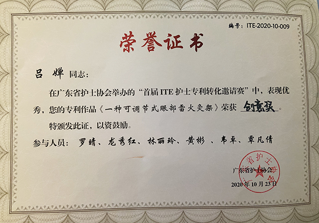 10月23日,由广东省护士协会主办、广东省中医院承办的“2020年ITE创新联盟分会成立大会暨首届护理专利转化邀请赛”在广州市顺利举行。经过激烈角逐,我院治未病中心护士长吕婵的参赛作品《一种可调节式眼部雷火灸架》荣获创意奖。