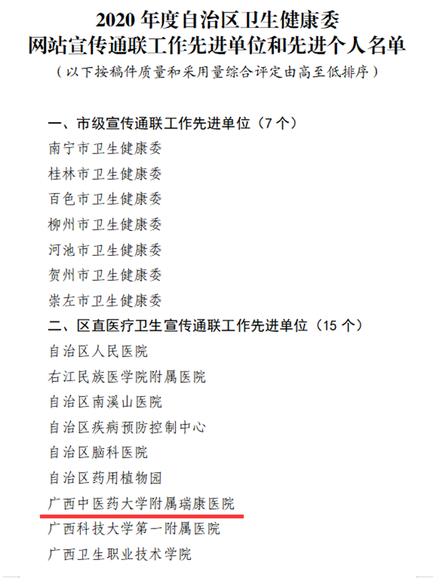 长期以来,医院高度重视医院品牌的塑造和舆论导向的引导,紧密围绕健康广西、深化医改、公卫服务、健康扶贫、中医药文化落地等工作采写新闻报道。今年疫情期间,我院进行了大量的疫情相关宣传工作,展示了医务人员的优秀品质,展现了医院良好的精神风貌,弘扬了社会正能量。 今后我院将“不忘初心、牢记使命”,继续做好医疗卫生宣传工作,做好医疗卫生科普宣传,配合疫情防控宣传工作,提高全民健康素养,为建设健康广西作出更大的贡献。 会议现场 表彰文件节选 荣誉证书