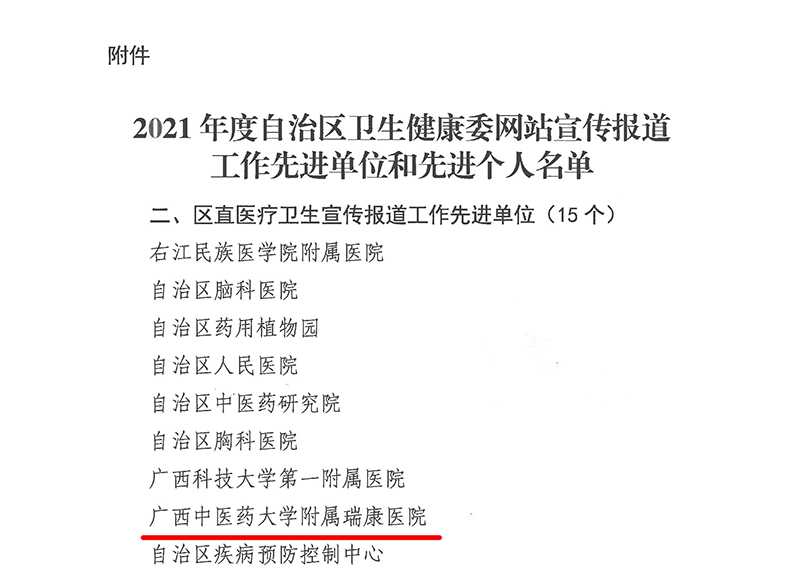 12月22日,自治区卫生健康委、自治区中医药管理局发布《自治区卫生健康委 自治区中医药管理局关于表扬2021年度自治区卫生健康委网站宣传报道工作先进单位和先进个人的通报》,《通报》对62个先进单位、60名先进个人予以通报表扬。我院继2017年、2018年、2019年、2020年后,连续第五年荣获“区直医疗卫生宣传报道工作先进单位”称号。