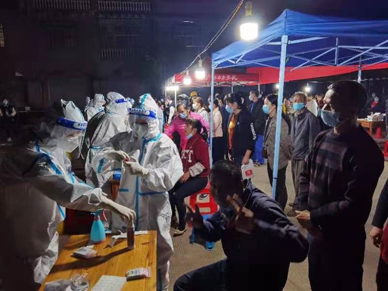 我院医疗队抵达防城港已为当天中午,主要负责防城港市光坡镇各乡村群众及当地企业、工厂人员的核酸检测工作,时间紧,任务重。核酸检测点彻夜灯火通明,医疗队队员们每天连续奋战12小时,12月25日,当地气温骤降,队员们虽身穿不透气的防护服,但还是感到阵阵寒意,这支几乎由巾帼女将组成的突击队,用最坚决的态度,拼出了瑞康人的速度和力度。村公所里、学校里、马路上甚至在田埂里,几乎都能看到我院医疗队队员的身影。 他们以高效的工作、专业的技术、丰富的经验、过硬的作风,让当地百姓竖起了拇指!