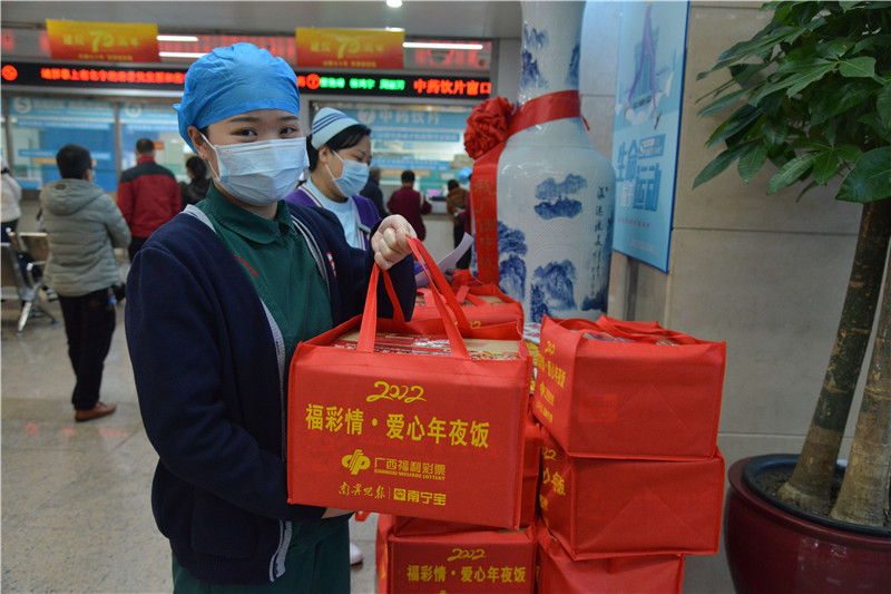据悉,此次“福彩情 爱心年夜饭”公益活动的受赠对象为参与边境地区新冠肺炎疫情防疫的医务工作者。约40名志愿者将兵分五路,分别前往广西中医药大学附属瑞康医院、广西中医药大学第一附属医院、广西医科大学第二附属医院、南宁市疾病预防控制中心、南宁市第一人民医院、南宁市第四人民医院、南宁市中医院、南宁市妇幼保健院,送上207份诚意满满的爱心年夜饭。