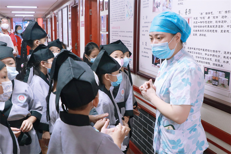 参加此次活动的小学生化身“小郎中”,分为两批次参观国医堂、院史馆、治未病中心、正骨推拿理疗馆和中医药博物馆,体验和感受中医药文化的特殊魅力。每个科室的讲解员为“小郎中”介绍了生活中常见的一些中医知识,让孩子们走进诊疗室近距离观看隔姜灸、小儿推拿、牵引、针灸、艾灸等特色中医疗法。在中医药博物馆里,“小郎中”们观看并聆听了梅花鹿皮毛标本、名医塑像、上百种中药材标本与饮片的详细介绍,药师们还采用了品养生药茶、尝五味和配制养生药膳等互动方式,大大地激发了孩子们对中医药文化的兴趣。