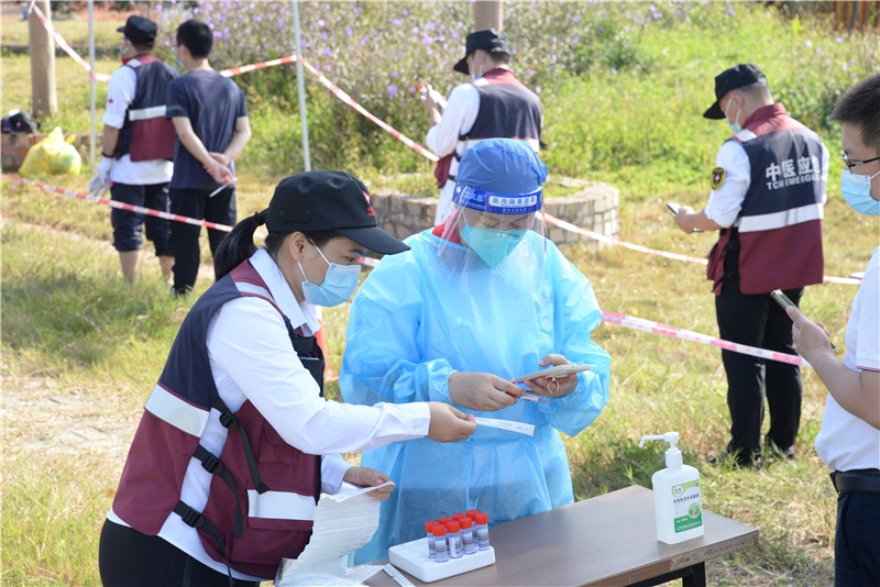 理论培训结束后,队伍赴隆安县进行实地演练。本次演练主题为模拟在隆安县发生地震,灾区爆发大规模呼吸道传染病,广西国家中医疫病防治队接到命令快速搭建帐篷方舱医院,收治轻症及无症状患者(预检分诊、治疗、转运),同时进行大规模人群核酸采样及检测,紧急应对突发公共卫生事件。