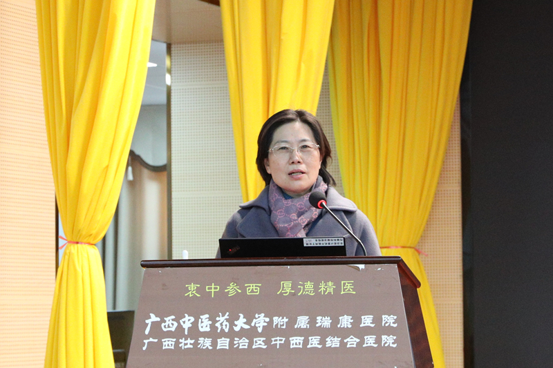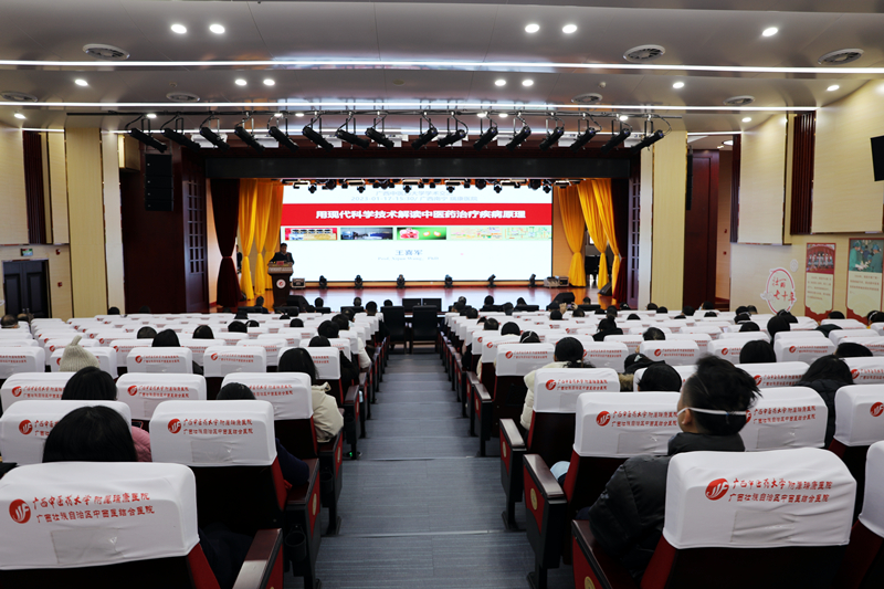 1月17日,国家重点学科中药学学科带头人、黑龙江中医药大学王喜军教授莅临我院授课。广西中医药大学副校长冷静、成果转化与社会服务处处长唐红珍、学科建设办公室主任吴林出席活动。我院党委书记高宏君,院长唐友明,党委副书记、副院长陈日兰,副院长韦思尊,纪委书记黄建民,副院长陈锋以及全体中层干部,各临床、医技、门诊科室等职工在B座十楼聆听讲学。