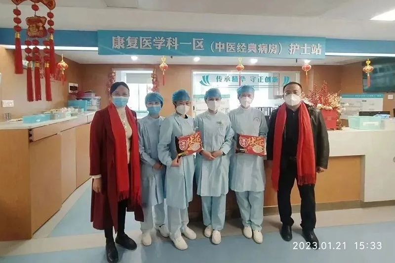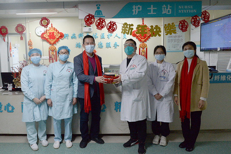 春临大地百花艳,节至人间万象新。在万家灯火,阖家团圆的除夕之夜及大年初一,医院党委书记高宏君、院长唐友明、纪委书记黄建民、副院长陈锋带领医院相关部门负责人来到各科室,亲切慰问春节期间坚守临床一线的医务人员、后勤值班人员及病友,为他们送去饺子、苹果和桔子,寓意“更岁交子”“平平安安”“大吉大利”,并向他们致以节日的问候和新春美好的祝愿。
