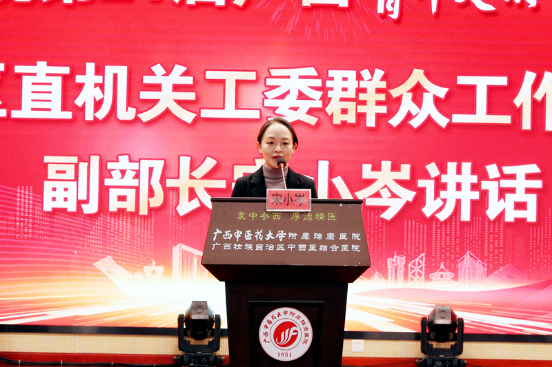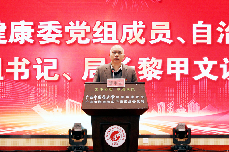 自治区卫生健康委党组成员,自治区中医药管理局党组书记、局长黎甲文,自治区党委区直机关工委群众工作部(统战部)副部长宋小岑,自治区卫生健康委直属机关党委专职副书记陈彦,自治区中医药管理局科教处处长张小磊、自治区中医药管理局医政处副处长刘畅、自治区卫生健康委团委书记吕向劼、广西中医药大学团委书记杨删,我院党委书记高宏君,党委副书记、副院长陈日兰,以及各市卫生健康委团委负责人、各有关医疗卫生机构领导、团干、青年代表近200人参加活动。活动由陈日兰主持。