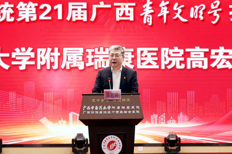 高宏君书记向来宾致以热烈的欢迎,对自治区卫健委、自治区中医药管理局给予的信任与支持表示诚挚的谢意,并对我院的情况作了简单的介绍。他表示,创建青年文明号活动是凝聚青年、团结青年、带领青年建功立业的有效形式,我院很荣幸能够为卫生健康行业的“论英雄”提供一个平台,希望我院青年能够好好把握这一宝贵的学习机遇,互相促进、互相提高,共同为中国卫生健康事业发展,为强国建设复兴伟业做出青春贡献。