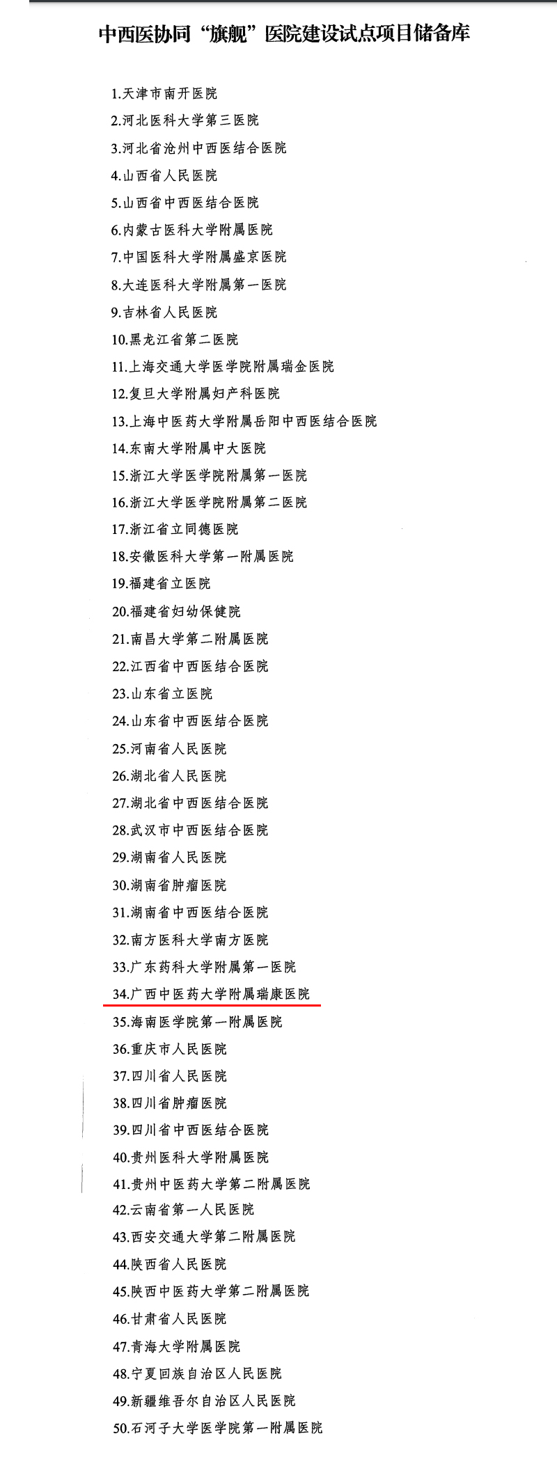 近日,国家发展和改革委员会办公厅、国家卫生健康委员会办公厅、国家中医药管理局综合司正式印发《中西医协同“旗舰”医院建设试点项目储备库和试点单位名单的通知》,广西中医药大学附属瑞康医院等50家医院正式获批国家中西医协同“旗舰”医院建设试点项目建设单位,瑞康医院是广西唯一入选的医院。