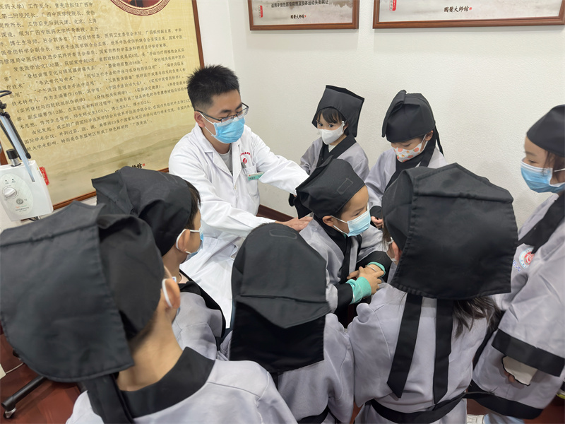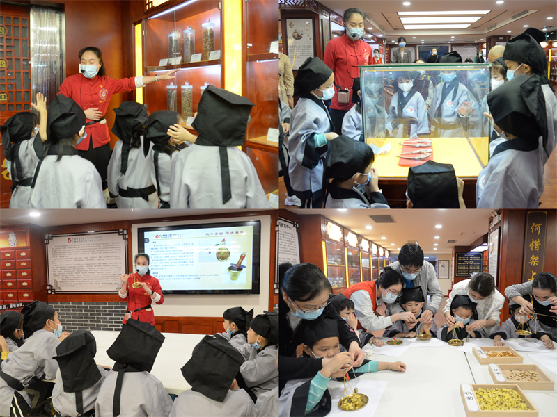 参加此次活动的小学生化身“小郎中”,分为两批次参观国医大师馆、院史馆、治未病中心、正骨推拿理疗馆和中医药博物馆,体验中医药文化,感受中医药的文化和特殊魅力。每个科室的讲解员为“小郎中”们介绍了生活中常见的一些中医知识,让孩子们走进诊疗室近距离观看脐灸、小儿推拿、牵引、针灸、艾灸等特色中医疗法。在中医药博物馆里,“小郎中”们不但聆听了梅花鹿皮毛标本、名医塑像、几百种的中药材标本与饮片的详细介绍,还参加了多项馆内体验活动,包括品尝养生药茶、学习辨别中药五味以及配制适宜的养生药膳等。