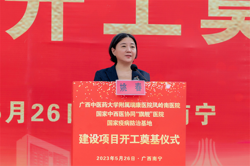 广西中医药大学党委副书记、校长姚春在致辞中提到,党中央、国务院高度重视中医药事业发展,把中医药提升到战略高度。习近平总书记在党的二十大报告中指出要“推进健康中国建设,把保障人民健康放在优先发展的战略位置”,强调要“促进中医药传承创新发展,健全公共卫生体系”,这为我们发展中医药事业指明了前进方向、提供了根本遵循。希望瑞康医院以凤岭南医院开工建设为契机,坚持中西医结合方针,抓住大好历史机遇,紧跟时代潮流、锐意进取,践行医教协同理念,完善中医药人才队伍建设,把握行业发展新机遇,发展中医药健康服务;切实担当中医药文化传承使命,推动中医药创新发展,打造享誉全区、辐射西南、影响东南亚地区的“瑞康品牌”。相信凤岭南医院的建设,必将不断优化广西中医药大学的学科布局,扩大优质医疗资源覆盖面,增强服务群众的能力,为推动全区中医药水平再上新台阶、推进健康广西建设做出新贡献。