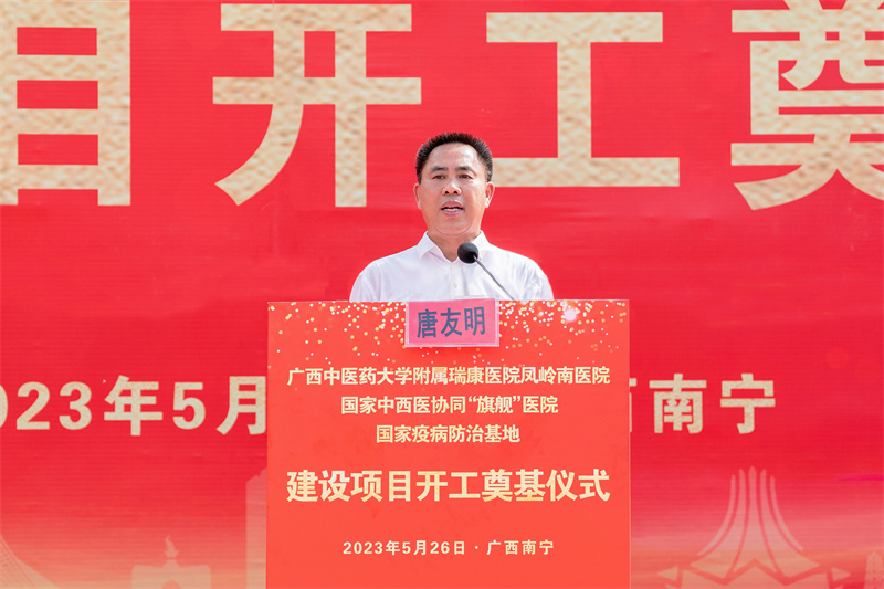 广西中医药大学附属瑞康医院院长唐友明在致辞中介绍了凤岭南医院项目的情况。他表示,凤岭南医院的建设不仅在瑞康医院发展史上具有里程碑的意义,也是瑞康人翘首以盼、引以为豪的民生工程,更是造福群众的一件大好事。希望全院广大干部职工发扬主人翁精神,进一步把思想统一到医院建设发展上来,围绕中心、服务大局,全力以赴抓好各项工作,无条件支持凤岭南医院的建设。希望医院建设项目现场指挥部及施工单位、监理单位、审计单位,从施工方案、施工技术、施工机械等各方面精心组织,加快施工进度的同时,强化质量意识,严格质量管理,确保安全生产。瑞康医院将以此次凤岭南医院项目开工奠基为契机,全面贯彻落实习近平总书记关于中医药工作的重要论述,以及党和国家的医疗卫生工作方针、政策,切实履行《中西医协同“旗舰”医院项目建设指导意见》相关要求,密切关注项目的施工进度、质量和安全,为建成高水平国家中西医协同“旗舰”医院而不懈奋斗,为广大人民群众提供更优质的中医、中西医结合医疗服务。