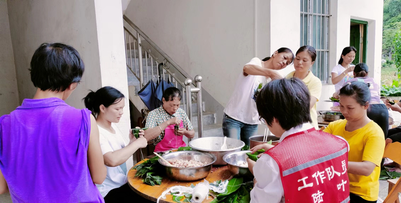 当天一大早,村民和干部一起把由驻村干部自费购买的粽叶、糯米、花生仁、五花肉等包粽子所需的材料整齐摆上桌,大家围在一起,纷纷使出看家本领,折叶、盛料、压实、包严、扎绳……大伙儿一边包粽子一边拉家常,有说有笑好不热闹,不一会儿功夫,600多个馅料十足、外观漂亮的粽子就包好下锅蒸煮了,粽香开始在空气中四溢弥漫。