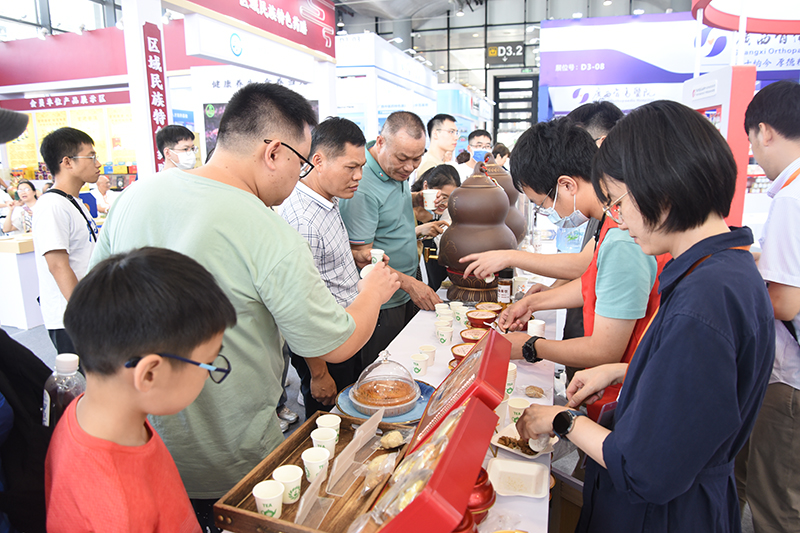在展示期间,唐友明院长、陈日兰副书记亲临现场指导并为嘉宾们作介绍。我院色香味俱全的广西“十大药膳”之首十全扶正鸽、香醇浓郁的肉桂奶茶、爽滑鲜甜的果冻膏、清新降燥的养生茶饮、包装精美的特色零食、品种齐全的精品制剂等产品,以良好的口感、独特的创意、切实的功效纷纷成为了展场的明星,参观的领导、专家及群众无不被吸引前来驻足欣赏并亲身品鉴,大家纷纷为医院的创新发展以及中医药的独特魅力点赞。另外,我院现场还为观众们提供健康咨询、推拿、刮痧等特色服务。