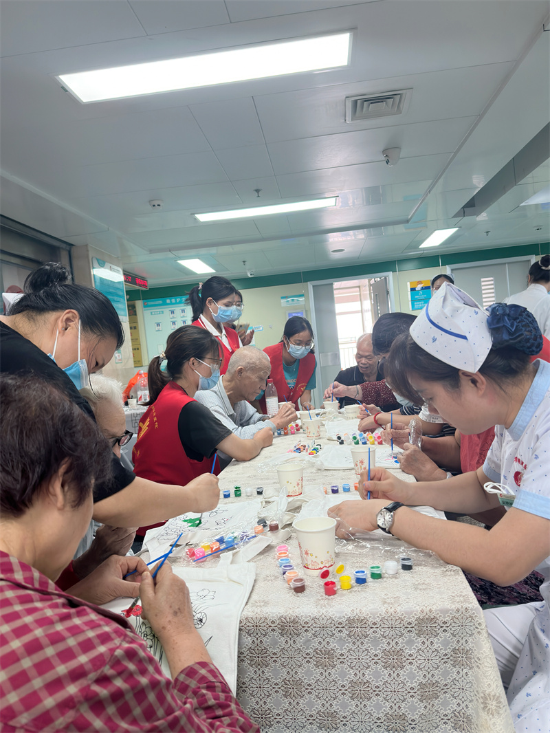 在“DIY创意帆布袋”环节,由社工部社工对制作DIY帆布袋的材料和用具进行简单讲解。随后,在医护人员和志愿者的协助下,老年病友及家属们迫不及待地拿起水粉毛笔,充分发挥自己的想象力和创造力,将喜欢的颜色填涂在帆布袋空白处。完成后,大家对自己的作品都爱不释手。