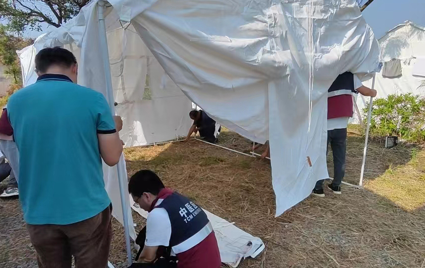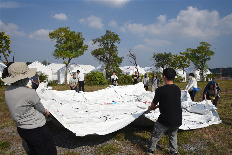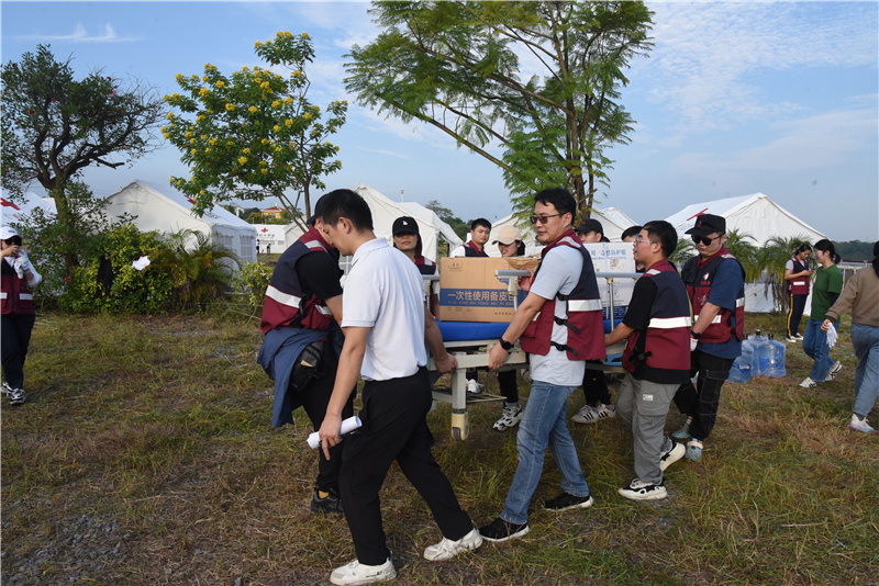 理论培训结束后,队伍前往美丽南方太阳谷基地进行实地演练。本次演练以模拟广西境内受到洪灾影响,出现山体滑坡造成人员伤亡,同时灾区暴发大规模呼吸道传染性疾病为背景。广西国家中医疫病防治队接到命令快速搭建帐篷方舱医院,收治外伤及呼吸道传染性疾病患者(预检分诊、治疗、转运),同时进行大规模人群核酸采样及检测,紧急应对突发公共卫生事件。