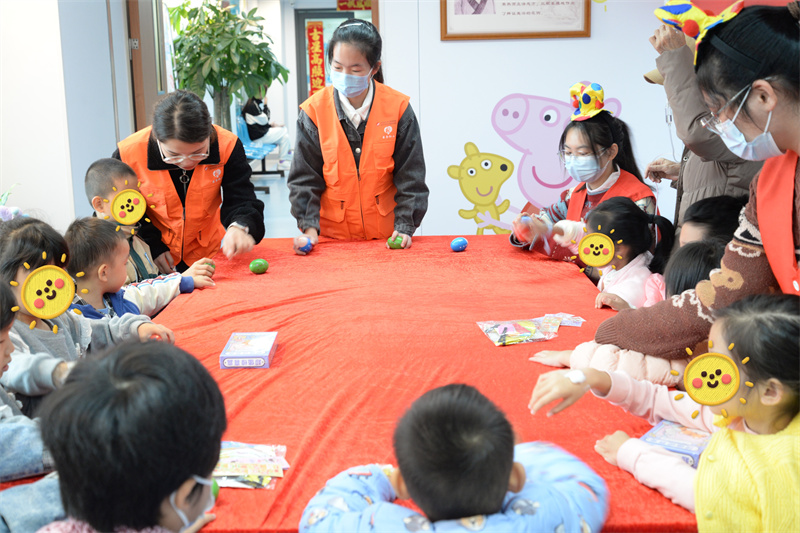 在“韵律沙球”环节,医务社工与现场的小朋友们手拿“沙球”,一起演唱《一闪一闪亮晶晶》,一边跟随着歌曲节奏摇晃“沙球”。现场的小朋友根据自己的节奏感顺利地完成传球,并获得了纪念品。