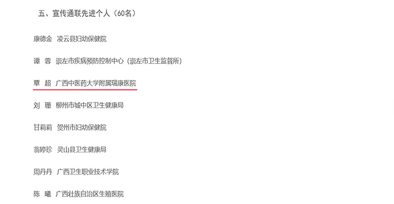 12月5日,自治区卫生健康委发布《自治区卫生健康委关于表扬2023年度自治区卫生健康委网站宣传报道工作先进单位和先进个人的通报》,《通报》对广西中医药大学附属瑞康医院等62个先进单位及60名先进个人予以通报表扬。这是我院连续七年被评为“区直医疗卫生宣传通联工作先进单位”,继续保持该项荣誉的“全收获”。