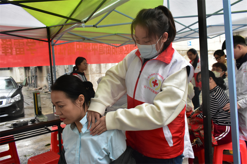 活动现场,前来参加义诊的居民络绎不绝,志愿者们热情引导居民有序排队等候。此次义诊活动免费为居民提供测量血压、手法按摩等服务,针对居民的健康问题,志愿者们也耐心给出了解答,同时还开展了急救知识宣传活动。前来咨询的多为老年人,他们主要受颈椎、肩膀等部位疼痛困扰,志愿者们通过询问了解到老人的身体状况后,结合所学知识,一对一进行艾灸或按摩。志愿者手法娴熟,用双手在患者身体各个穴位上进行揉搓、推拿、拍打,来促进血液循环,缓解患者疼痛。整个活动现场洋溢着幸福融洽的氛围,受到了居民们的一致好评。