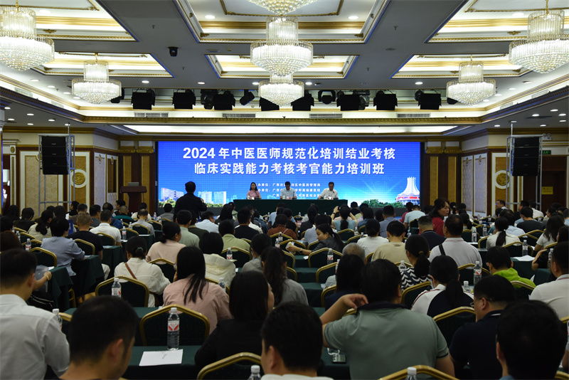为进一步做好自治区2024年中医医师规范化培训和中医助理全科医师培训结业考核临床实践能力考核工作,提高各基地考官素质和执考水平,5月11日,由自治区中医药管理局主办,广西中医药大学附属瑞康医院承办的2024年广西中医规培结业考核临床实践能力考核考官能力培训班在南宁举行。自治区中医药管理局科技教育处副处长王浪浪,自治区卫生健康人才与技术服务中心主任闭闵,广西中医药大学附属瑞康医院院长、基地主任唐友明,党委副书记、副院长陈日兰,复旦大学附属儿科医院王宏胜教授出席开班仪式。来自区内各中医规培基地考官、考务人员约500人参加培训。