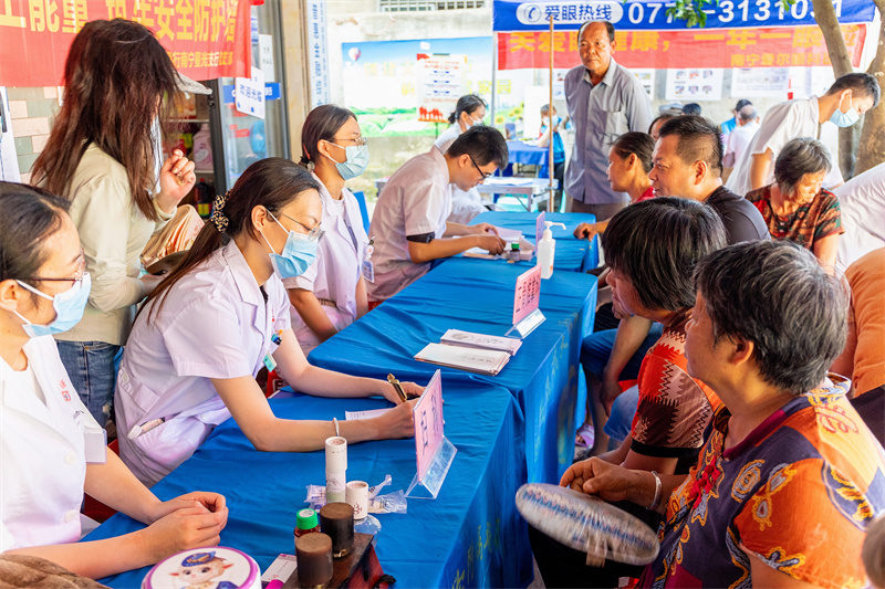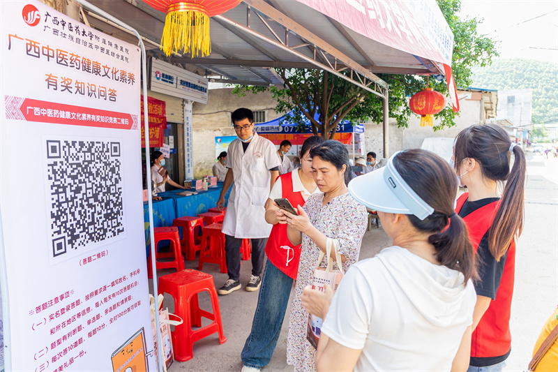 义诊现场,志愿者们通过健康宣教、发放宣传册等形式向村民们普及中医药健康文化知识,并指导居民们扫描二维码填写中医药健康文化素养调查问卷,学习知识的同时赢取中药香囊、生活用品等奖品。