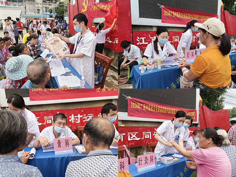 为贯彻落实广西中医药健康文化素养调查监测工作相关文件精神,进一步提升我区人民群众的中医药健康文化素养,5月28日上午,我院宣传部、医疗服务部组织老年病科、妇科、骨科、治未病中心、针灸科、正骨推拿理疗馆等科室专家团队再次来到南宁市江南区江西镇开展广西中医药文化进基层暨中医药健康文化素养知识宣教活动,为村民们诊疗的同时,向他们普及中医药健康知识。