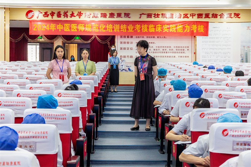 按照国家统一部署,根据《自治区中医药局关于开展2024年全区中医住院医师规范化培训和中医助理全科医生培训结业考核工作的通知》(桂中医药科教发〔2024〕4号)文件精神,6月1日至2日,在广西中医药大学明秀校区及广西中医药大学附属瑞康医院,我院顺利完成了2024年全区中医住院医师规范化培训和中医助理全科医生培训结业考核工作,广西中医药管理局局长黎甲文、科教处副处长王浪浪,自治区卫生健康人才与技术服务中心主任闭闵,我院党委书记高宏君,院长唐红珍,党委副书记、副院长陈日兰,纪委书记黄建民等领导亲临考试现场进行巡视指导。本次共有414名考生参加考核,其中中医类别考生323人,中医助理全科考生91人。