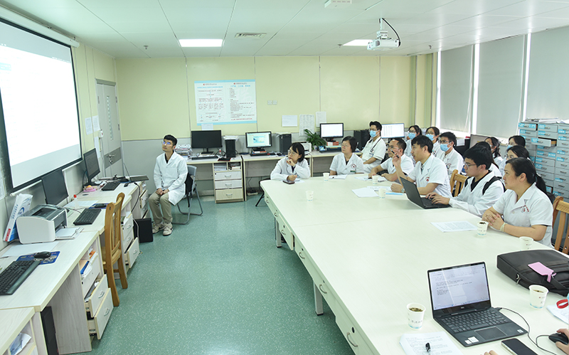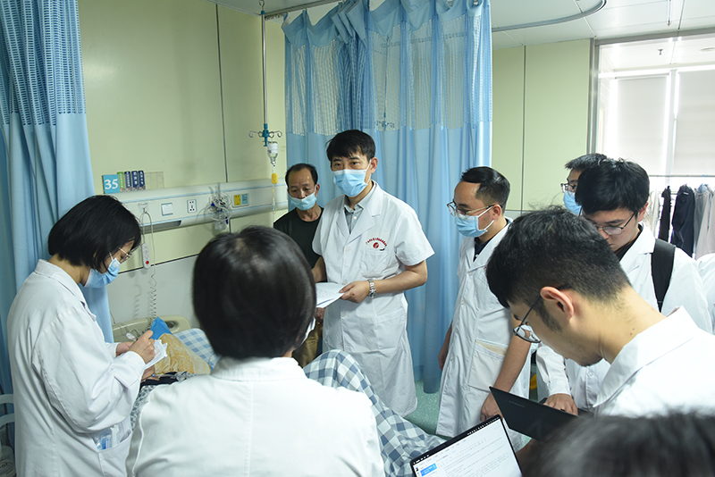 许家栋教授通过望、闻、问、切亲自对患者进行了查体,系统全面地询问病史,详细了解患者的病情信息。查房结束后,根据对该患者的四诊资料,从中医“病因病机、辨证论治、转归预后”等方面进行深入的探讨。在听取主管医师的病例汇报及参会医师讨论后,许家栋教授充分肯定了目前的诊疗方案,并在此基础上,对患者组方用药等提出了全方位且具针对性的分析和建设性指导,耐心答疑解惑,倾囊分享了其个人丰富的临证用方经验和辨治思路。