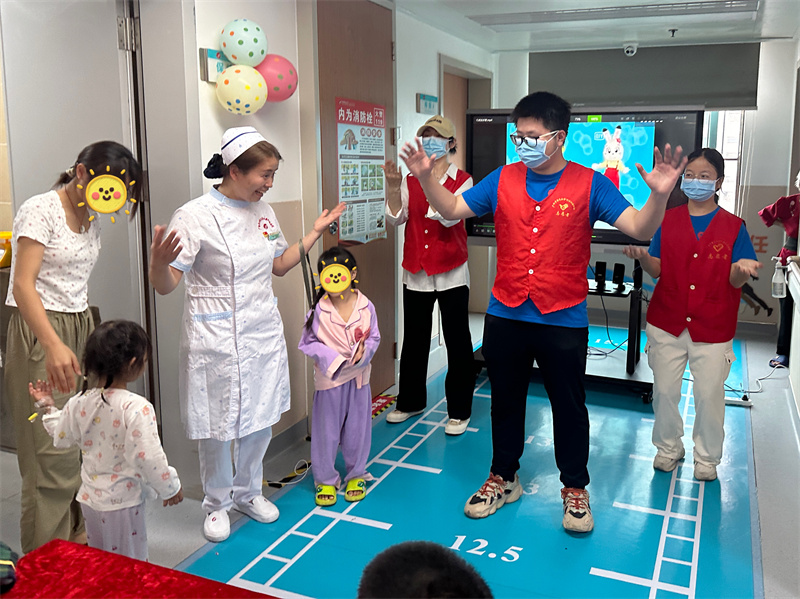 接下来,我院志愿服务队队员们为患儿们带来了欢快的《洗手歌》表演。他们身着明亮的服装,用生动有趣的动作和欢快的歌声,向孩子们传递了正确洗手的方法。孩子们看着表演,有的跟着节奏轻轻摇摆,有的则跟着一起哼唱,病房里充满了欢声笑语。