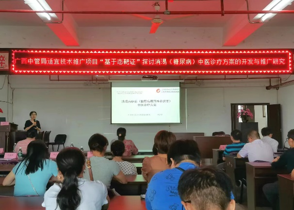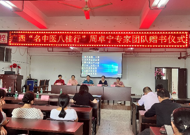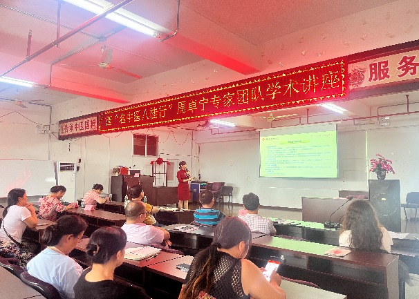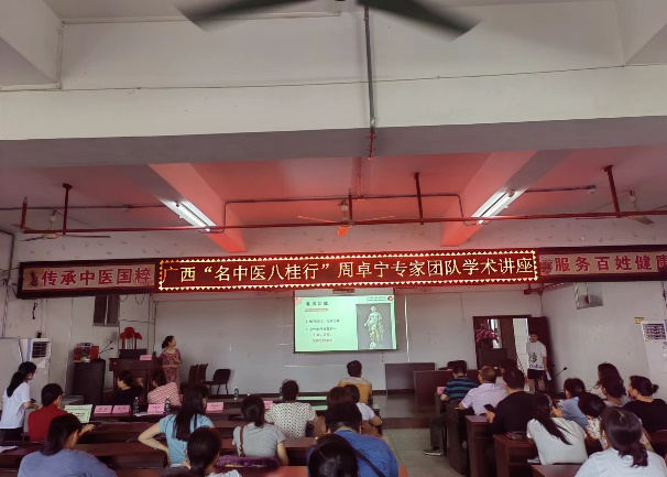 当天下午,周卓宁专家团队在兴安县中医医院开展学术讲座。讲座伊始,周卓宁专家团队向兴安县中医医院赠书。随后,周卓宁教授以《消渴痹证(糖尿病周围神经病变)中医诊疗方案》为题进行授课,以介绍当前糖尿病周围神经病变流行病学史的严峻形势作为切入点,阐述中医药治疗糖尿病周围神经病变具有全方位的优势,紧接着详细论述该诊疗方案的相关特色疗法,具体包括穴位贴敷、耳穴压豆、体针疗法、艾灸疗法、按摩推拿疗法、中药足浴治疗、饮食药膳及传统功法等。莫小勤教授以《急性乳腺炎(乳痈)的中医治疗》为题进行授课,通过分享急性乳腺炎的中医辨证分型,论治中医特点及辨方选药,强调乳痈的的护理及注意事项。蒋娴副教授分享关于“中医养生与药膳食养”的内容,为糖尿病患者饮食提供一定的指导。