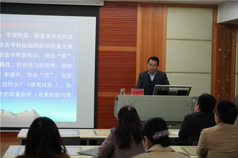 本期培训邀请了南宁师范大学任初明教授就“如何写好教改申报书”做专题讲座。任初明教授是中国院校研究学会常务理事、中国高等教育学专业委员会理事、广西教育学会教育管理分会副理事长、广西教育战略研究专家咨询委员,《高教论坛》杂志副主编。曾获区级社科优秀成果奖2项,区级教学成果一等奖2项,有着丰富的教学改革研究课题申报、评审经验。