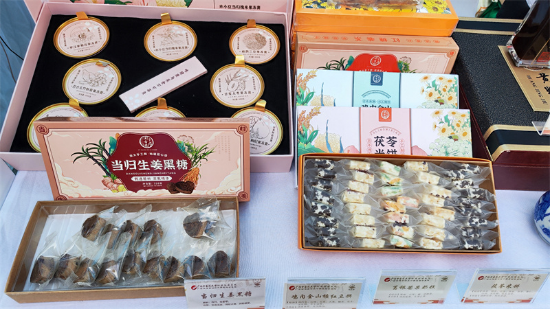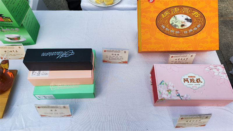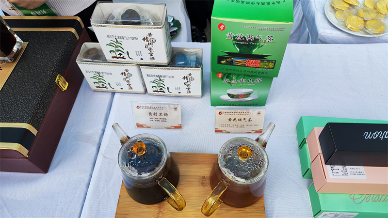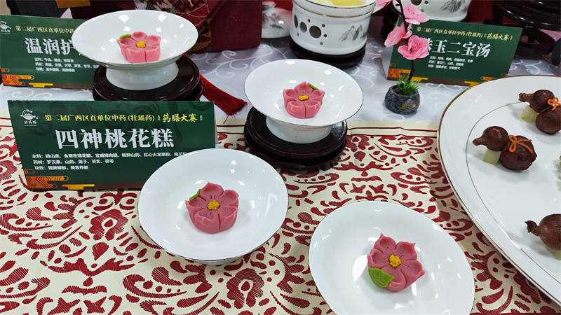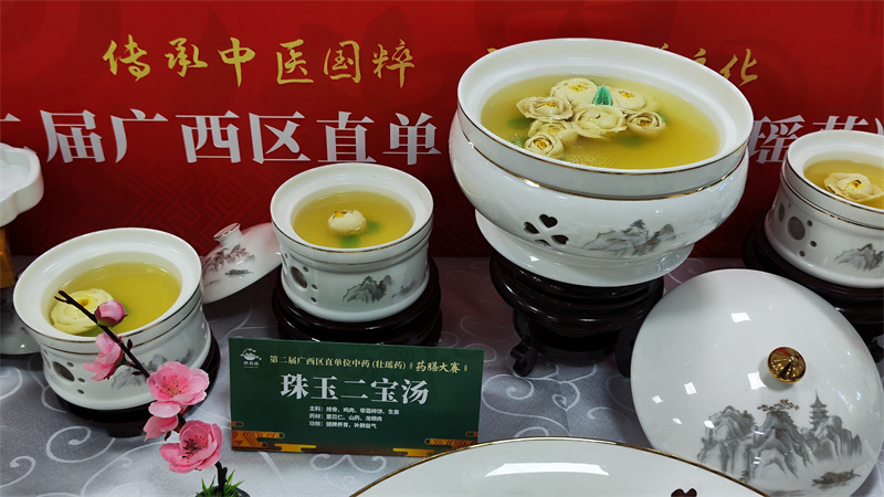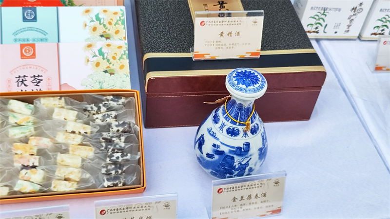 在比赛如火如荼进行的同时,比赛场外的中药(壮瑶药)食养食疗产品展区也人声鼎沸。我院展区摆出了数十种医院自主研发的中医药特色药膳食品,有药膳奶茶、药膳果冻、药膳糕点、养生茶、养生酒等,吸引了许多人驻足参观品鉴,现场十分热闹。