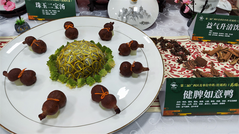 6日,药膳技能实操比赛则将比赛气氛推至高潮。根据比赛规则,参赛队需在120分钟内完成5个药膳菜点制作,其中包括药膳热菜,药膳冷菜,药膳汤品、中华药膳茶饮和自选菜品。“人以水谷为本,脾胃为水谷之海,故又云脾胃为后天之本,气血生化之源。”我院以“八桂健脾宴”为主题,精心准备了健脾如意鸭、温润护脾冻、珠玉二宝汤、益气升清饮、四神桃花膏五道药膳,八桂健脾宴以广西道地甘温之品配与禽畜水产,制作凉热菜肴、汤点、面食,以期驱气候之湿、固桂人之本、传养生之道,燃药膳之光。经过精心烹调,“八桂健脾宴”以精美的造型、极致的刀工、绝妙的口感和独具匠心的搭配赢得了现场评委的一致好评。在经过了专家品评、陈述答辩、现场点评等环节后,我院从45支区(省)级选拔队中脱颖而出,荣获大赛团体奖二等奖,并顺利晋级决赛。