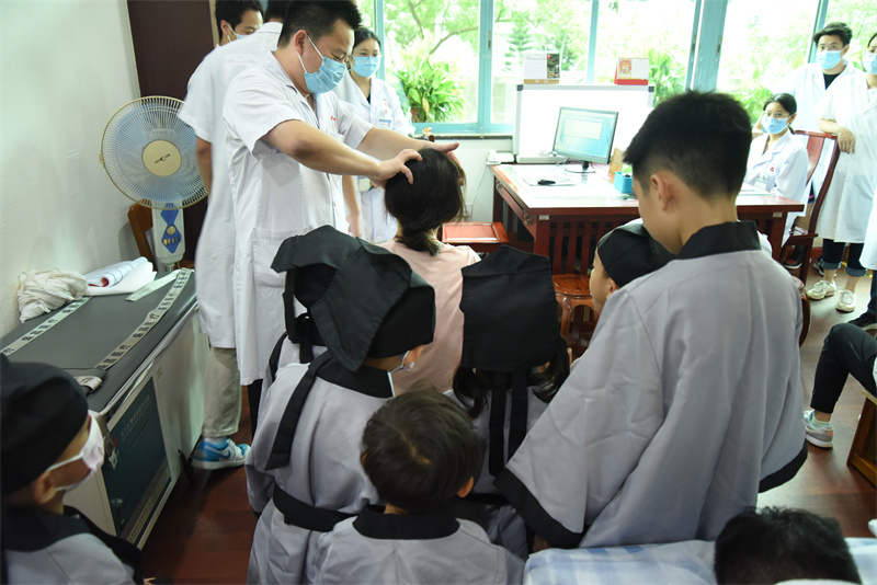 活动中,孩子们化身“小郎中”,参观了国医大师馆、院史馆、治未病中心、正骨推拿理疗馆和中医药博物馆,认真聆听讲解员介绍中医药知识及生活中的一些健康小常识。“小郎中”们还走进诊疗室近距离观看脐灸、小儿推拿、牵引、艾灸等中医特色疗法,感受博大精深且无处不在的中医药文化。
