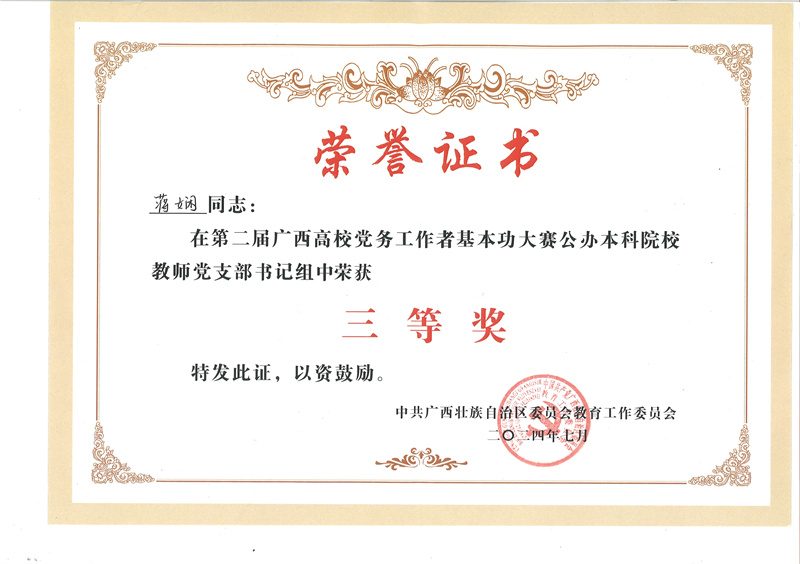 7月9日至10日,第二届广西高校党务工作者基本功大赛(公办本科院校组)在桂林理工大学举行。我院党委选派的蒋娴同志荣获教师党支部书记组三等奖。
