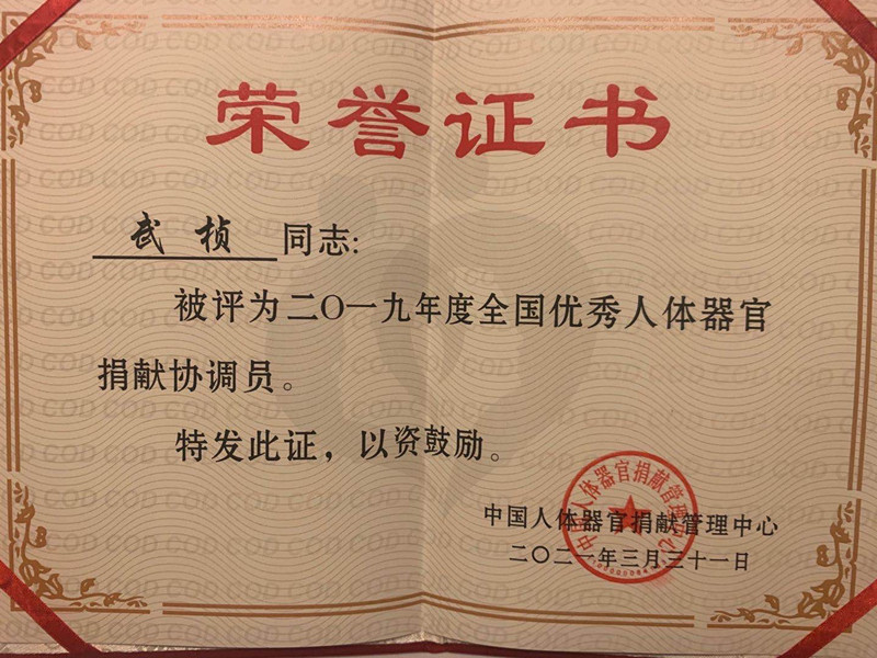 3月31日,由中国红十字会总会、国家卫生健康委员会指导,中国人体器官捐献管理中心主办,江苏省红十字会、南京市红十字会承办的2021年全国人体器官捐献缅怀纪念活动在南京市遗体器官捐献者纪念林举行,主题为“生命的乐章”。会上,我院OPO(人体器官获取组织)协调员武桢荣获2019年度“全国优秀人体器官捐献协调员”称号。中国红十字会副会长于福龙为其颁奖。