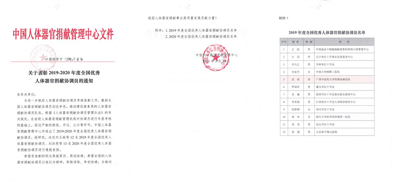 我院于2013年成立人体器官获取组织(Organ Procurement Organizations,简称opo),并逐步建立起一支专业协调员队伍,近年来协调的器官捐献量一直稳步提高,已成功实现器官捐献200余例,实现心脏、肺脏、肝脏、肾脏等大器官捐献600余个,角膜100余对,挽救了600余人的生命,使100多人重见光明。其中,2020年捐献案例51例。为促进捐献工作更好的开展,激励全国人体器官捐献协调员创优争先,推动建设高素质的人体器官捐献协调员队伍,在省级人体器官捐献管理机构对协调员进行年度考核的基础上,经过严格的推选,评议,公示等环节,中国人体器官捐献管理中心评选出了2019-2020年度全国优秀人体器官捐献协调员,2019年和2020年分别有12和13人获此殊荣。此次获奖是国家层面对我院捐献工作的充分认可。我院OPO也将以此为契机,结合医院特色,发挥学科优势,进一步为全区及全国的器官捐献与移植事业做出自己的贡献。