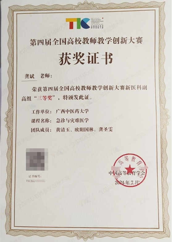 7月27-31日,第四届全国高校教师教学创新大赛现场赛在电子科技大学举办,全国各省市自治区有1700余位教师提交的近500门课程进入现场比拼。我院《急诊与灾难医学》课程教学团队龚斌、黄清玉代表广西区新医科副高组参赛,获得三等奖。