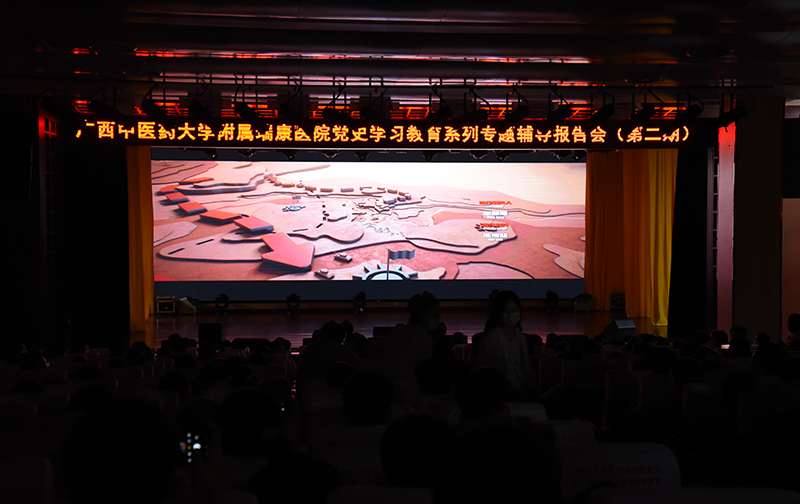 医院党委书记高宏君以《光辉的历程》为题作专题辅导报告。党委副书记、院长唐友明,党委委员、副院长、总会计师庞刚,党委委员、副院长韦思尊出席报告会。医院各支部党员代表、入党积极分子、发展对象、预备党员、规培生、实习生党员代表400余人参加报告会。报告会由庞刚主持。