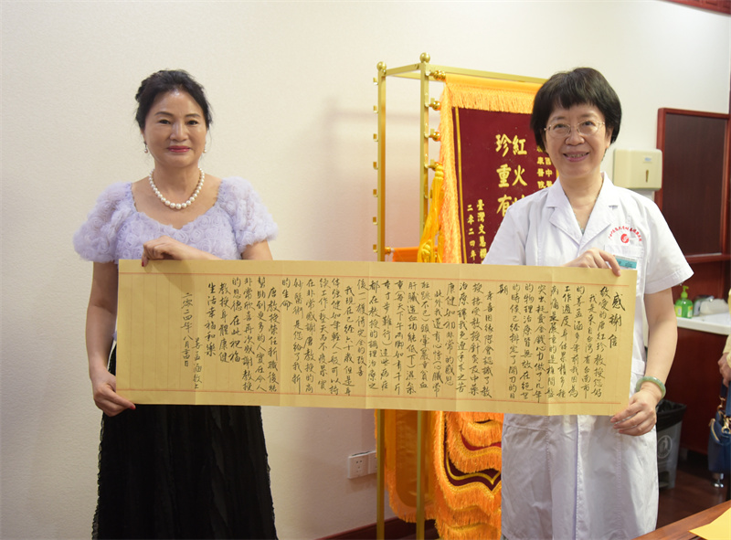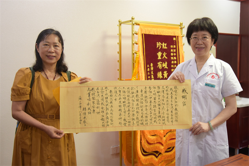 一幅书法作品,两封感谢信,十二面锦旗,它们不仅承载着台湾同胞们对唐红珍教授的敬意和感谢,还是对传统中医药的肯定,更是两岸医疗交流与人文关怀的生动见证。今后,医院将继续秉持“坚持以病人的健康和生命安全为中心”的服务理念,努力搭建更广阔的平台,传承发扬中医药文化,提升医疗服务质量,为更多的患者带来健康和希望。